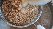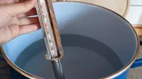 Nach dem Kochen wird die Hefe beigemengt. Zuvor muss das Gebräu jedoch abkühlen, denn bei zu heißer Flüssigkeit geht die Hefe kaputt. Um das Bier schnell abzukühlen, stelle ich den Topf in den Keller. Nach gut drei Stunden ist es dann endlich so weit: Ich kann das braune Gemisch in mein Gärfass abfüllen. Im Anschluss streue ich die Hefe in den Behälter und verschließe das Fass mit dem Gärspund, der, wenn ich alles richtig gemacht habe, in den nächsten Tagen wegen der Gärung immer wieder hochhüpfen sollte.